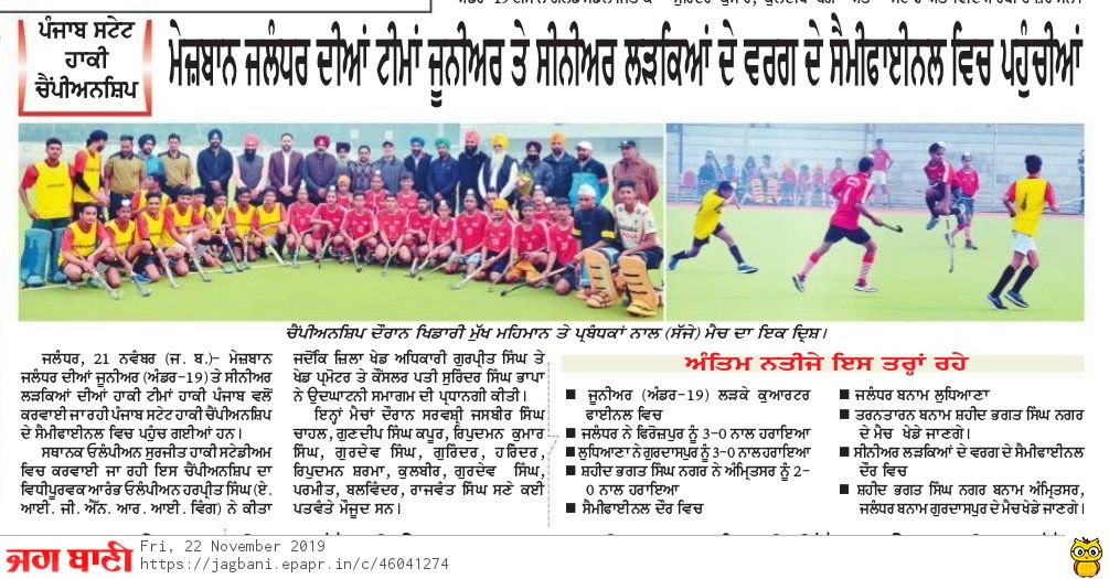 - Punjab Hockey League (PHL) 2024-- PIS Ludhiana beat SGPC Hockey Academy 3-2 Surjit Hockey Academy Jalandhar beat PIS Mohali 4-2